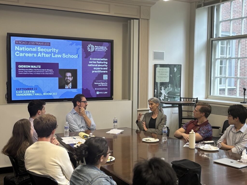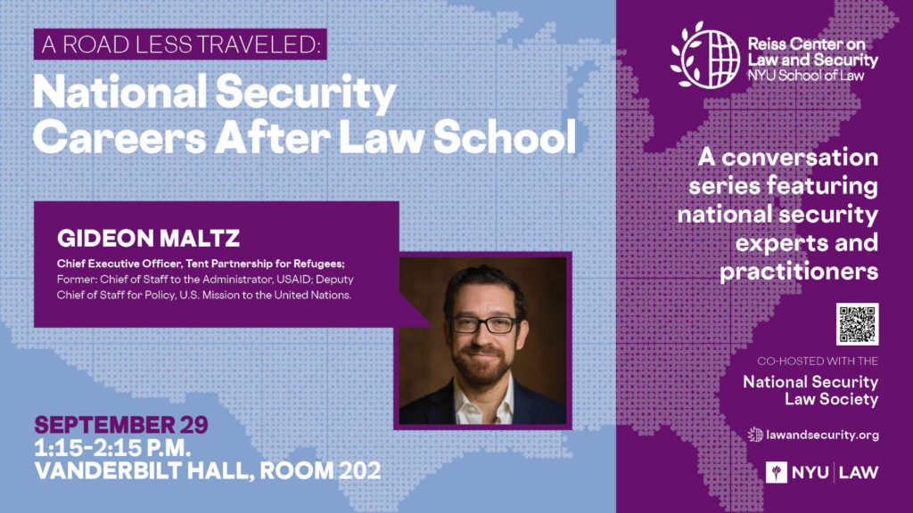 On September 29, 2025, The Reiss Center on Law and Security & the National Security Law Society welcomed the first speaker of the 2025-2026 season of A Road Less Traveled: Gideon Maltz, Chief Executive Officer, Tent Partnership for Refugees.